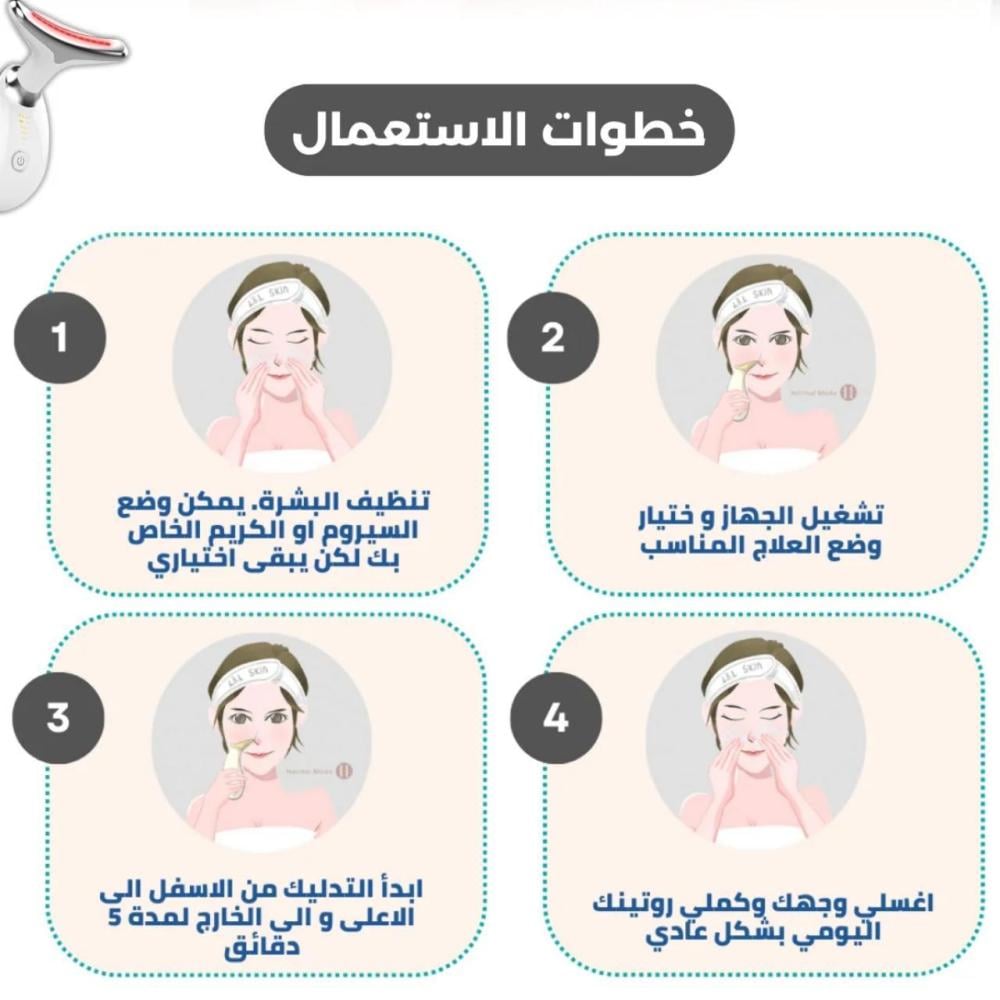 طريقة الاستخدام للحصول على أفضل النتائج: للحصول على نتيجة تضاهي جلسات التجميل، ضعي السيروم المفضل لديك أو كريم الترطيب، ثم مرري جهاز لفت قلو بحركات من الأسفل إلى الأعلى على منطقة الرقبة والوجه لمدة 10 دقائق يومياً.